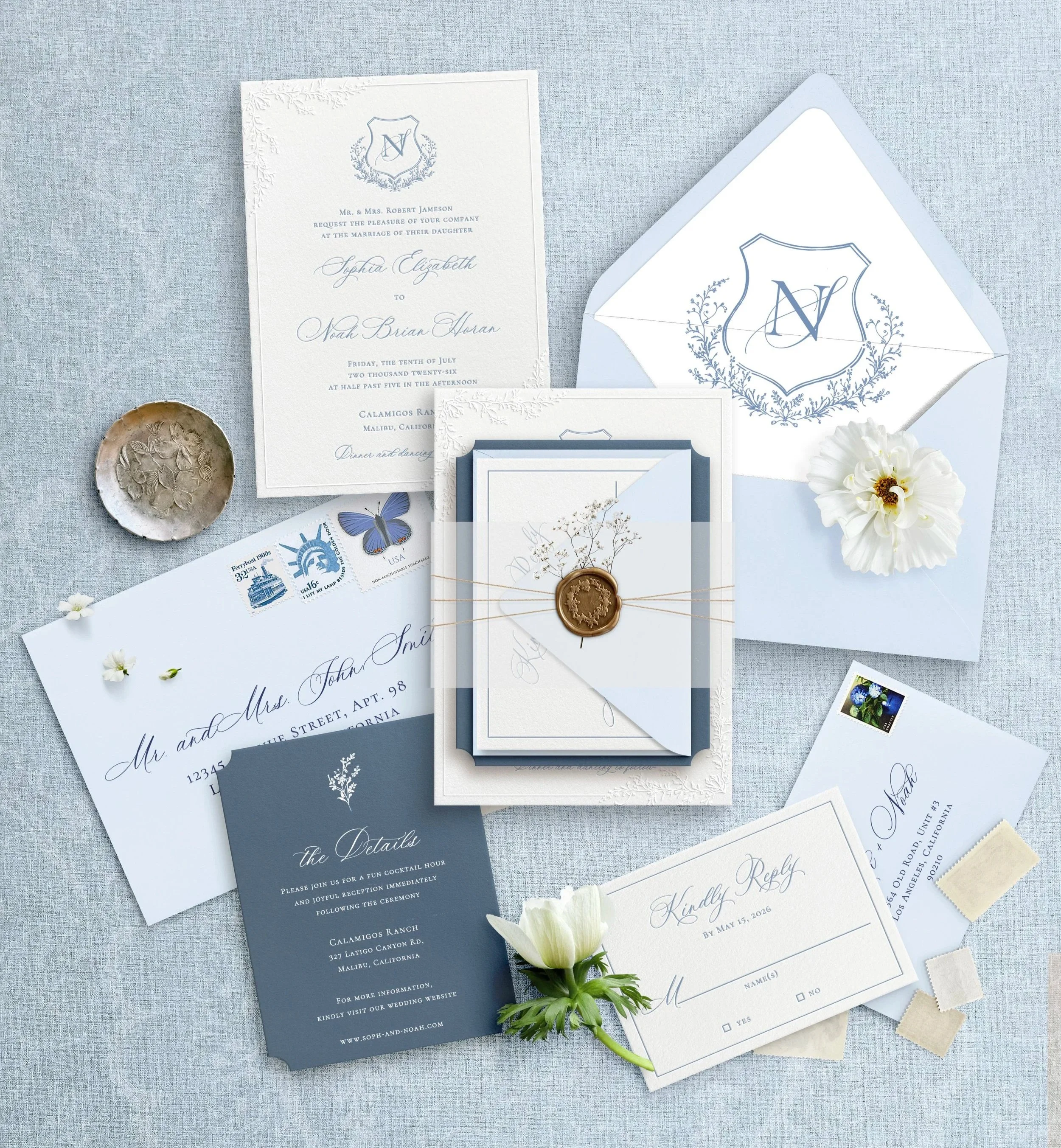 Semi-custom invitations are the perfect way to have something beautiful and personal without the full custom process or price. Each suite begins with one of our signature designs, designed to feel timeless, elegant, and versatile. You can make it your own by choosing your wording, colors, envelope liners, and print options, allowing you to customize the details while keeping the process simple and approachable. This option is ideal if you’re drawn to our design style but want a more streamlined experience.