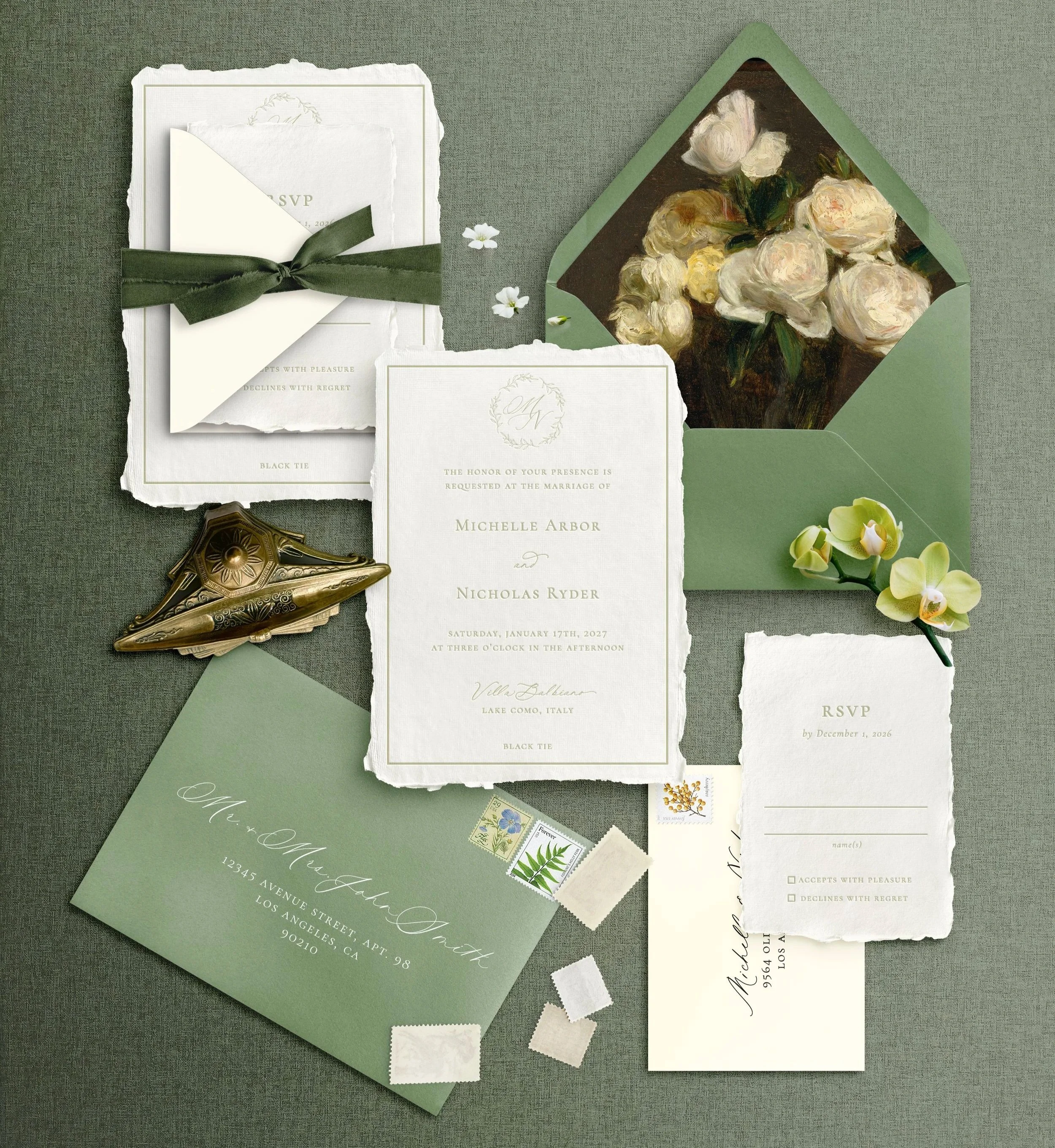 The Christine Suite is for the classic minimalist. It features a clean serif typeface in elegant capitals along with a touch of gentle script details. The olive branch wreath adds a touch of femininity without excess, creating a look that’s timeless, poised, and effortlessly sophisticated.